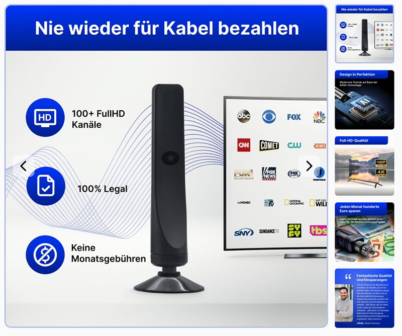 âIch war skeptisch, aber die Antenne funktioniert wirklich. Wir empfangen ĂŒber 80 Sender in HD und haben unseren Kabelanschluss sofort gekĂŒndigt. Endlich keine monatlichen Rechnungen mehr!â