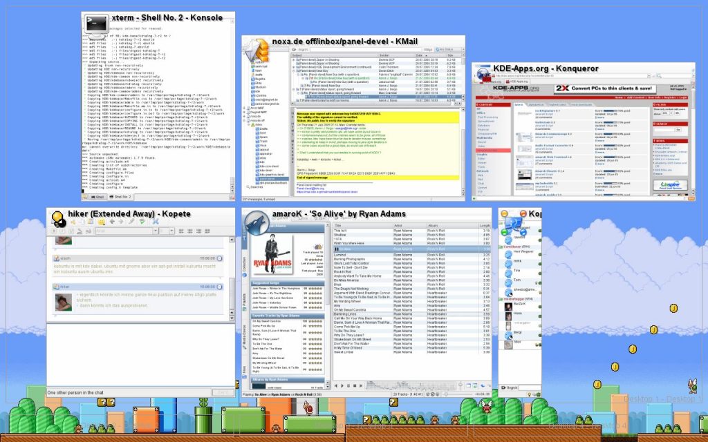 Komposé Komposé bietet eine Vollbildansicht aller Ihrer Aufgaben und/oder virtuellen Desktops, wobei jedes Fenster durch einen skalierten, eigenen Screenshot dargestellt wird. Download Download im KDE Store unter https://store.kde.org/p/1220207